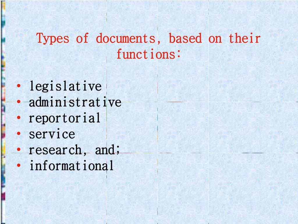 Types of documents, based on their functions: • legislative • administrative • reportorial • service • research, and; • informational