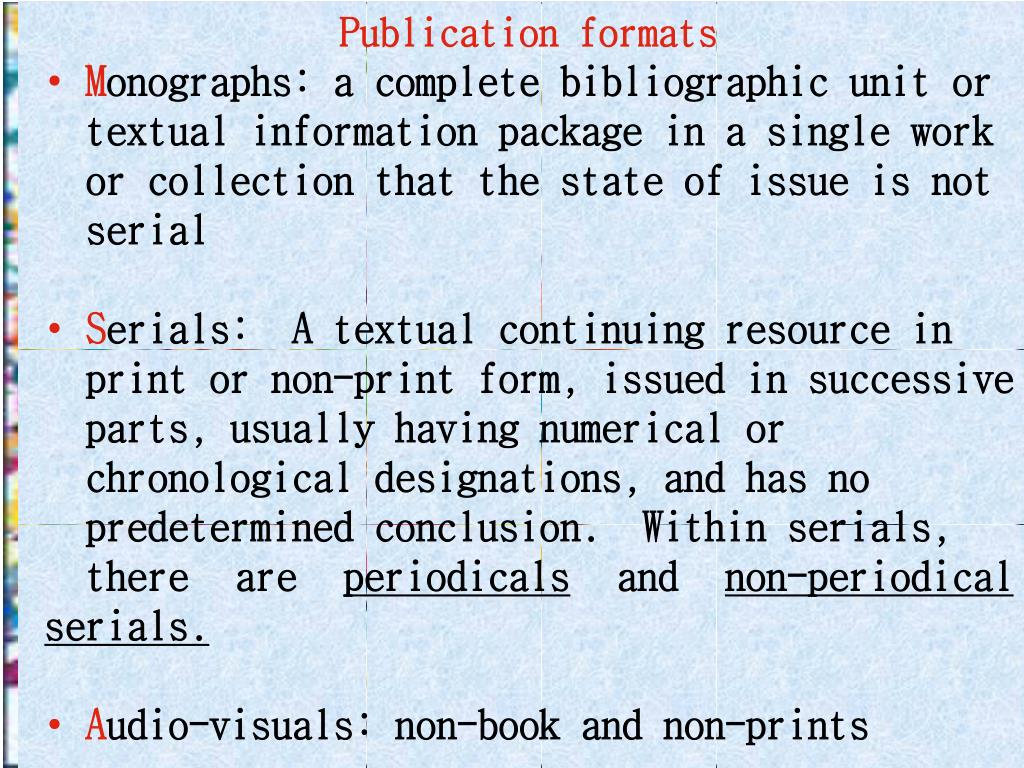 Publication formats • Monographs: a complete bibliographic unit or • textual information package in a single work • or collection that the state of issue is not • serial • Serials: A textual continuing resource in • print or non-print form, issued in successive • parts, usually having numerical or • chronological designations, and has no • predetermined conclusion. Within serials, • there are periodicals and non-periodical serials. • Audio-visuals: non-book and non-prints