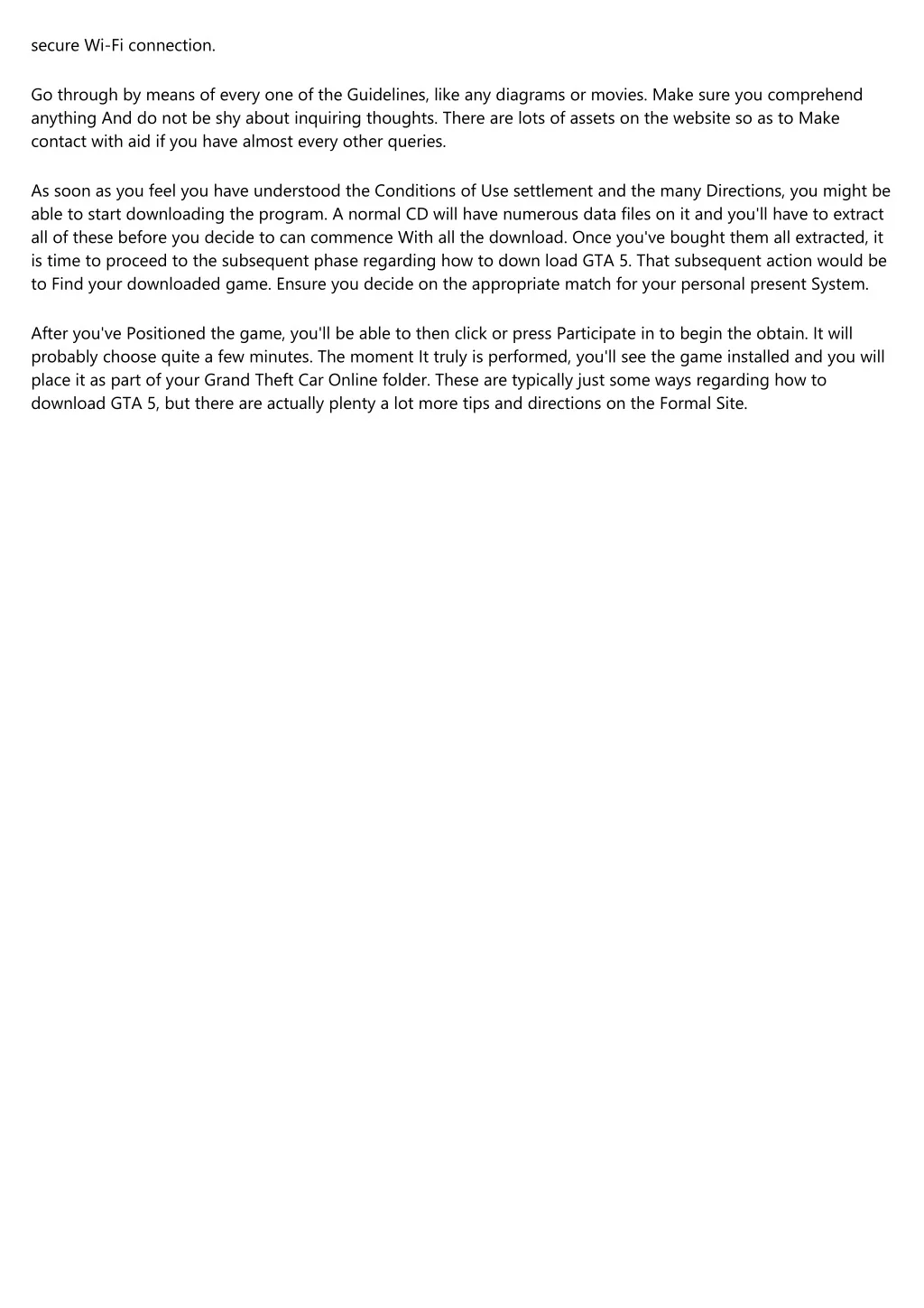 secure Wi-Fi connection. Go through by means of every one of the Guidelines, like any diagrams or movies. Make sure you comprehend anything And do not be shy about inquiring thoughts. There are lots of assets on the website so as to Make contact with aid if you have almost every other queries. As soon as you feel you have understood the Conditions of Use settlement and the many Directions, you might be able to start downloading the program. A normal CD will have numerous data files on it and you'll have to extract all of these before you decide to can commence With all the download. Once you've bought them all extracted, it is time to proceed to the subsequent phase regarding how to down load GTA 5. That subsequent action would be to Find your downloaded game. Ensure you decide on the appropriate match for your personal present System. After you've Positioned the game, you'll be able to then click or press Participate in to begin the obtain. It will probably choose quite a few minutes. The moment It truly is performed, you'll see the game installed and you will place it as part of your Grand Theft Car Online folder. These are typically just some ways regarding how to download GTA 5, but there are actually plenty a lot more tips and directions on the Formal Site.