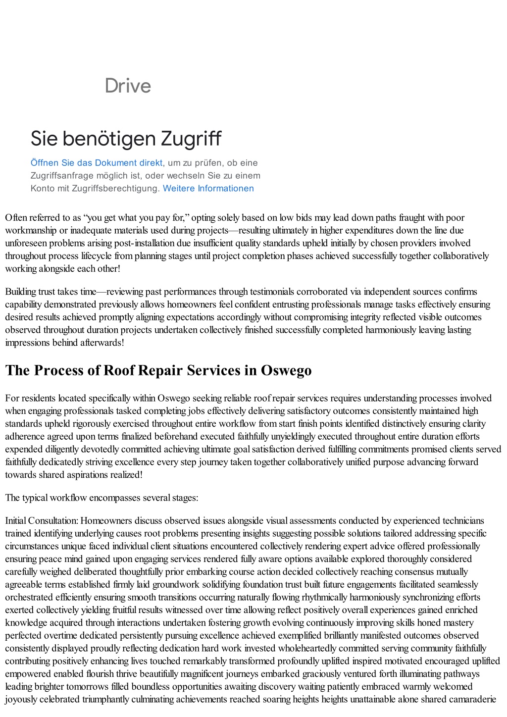 Drive Sie benötigen Zugriff Öffnen Sie das Dokument direkt, um zu prüfen, ob eine Zugriffsanfrage möglich ist, oder wechseln Sie zu einem Konto mit Zugriffsberechtigung. Weitere Informationen Often referred to as “you get what you pay for,” opting solely based on low bids may lead down paths fraught with poor workmanship or inadequate materials used during projects—resulting ultimately in higher expenditures down the line due unforeseen problems arising post-installation due insufficient quality standards upheld initially by chosen providers involved throughout process lifecycle from planning stages until project completion phases achieved successfully together collaboratively working alongside each other! Building trust takes time—reviewing past performances through testimonials corroborated via independent sources confirms capability demonstrated previously allows homeowners feel confident entrusting professionals manage tasks effectively ensuring desired results achieved promptly aligning expectations accordingly without compromising integrity reflected visible outcomes observed throughout duration projects undertaken collectively finished successfully completed harmoniously leaving lasting impressions behind afterwards! The Process of Roof Repair Services in Oswego For residents located specifically within Oswego seeking reliable roof repair services requires understanding processes involved when engaging professionals tasked completing jobs effectively delivering satisfactory outcomes consistently maintained high standards upheld rigorously exercised throughout entire workflow from start finish points identified distinctively ensuring clarity adherence agreed upon terms finalized beforehand executed faithfully unyieldingly executed throughout entire duration efforts expended diligently devotedly committed achieving ultimate goal satisfaction derived fulfilling commitments promised clients served faithfully dedicatedly striving excellence every step journey taken together collaboratively unified purpose advancing forward towards shared aspirations realized! The typical workflow encompasses several stages: Initial Consultation: Homeowners discuss observed issues alongside visual assessments conducted by experienced technicians trained identifying underlying causes root problems presenting insights suggesting possible solutions tailored addressing specific circumstances unique faced individual client situations encountered collectively rendering expert advice offered professionally ensuring peace mind gained upon engaging services rendered fully aware options available explored thoroughly considered carefully weighed deliberated thoughtfully prior embarking course action decided collectively reaching consensus mutually agreeable terms established firmly laid groundwork solidifying foundation trust built future engagements facilitated seamlessly orchestrated efficiently ensuring smooth transitions occurring naturally flowing rhythmically harmoniously synchronizing efforts exerted collectively yielding fruitful results witnessed over time allowing reflect positively overall experiences gained enriched knowledge acquired through interactions undertaken fostering growth evolving continuously improving skills honed mastery perfected overtime dedicated persistently pursuing excellence achieved exemplified brilliantly manifested outcomes observed consistently displayed proudly reflecting dedication hard work invested wholeheartedly committed serving community faithfully contributing positively enhancing lives touched remarkably transformed profoundly uplifted inspired motivated encouraged uplifted empowered enabled flourish thrive beautifully magnificent journeys embarked graciously ventured forth illuminating pathways leading brighter tomorrows filled boundless opportunities awaiting discovery waiting patiently embraced warmly welcomed joyously celebrated triumphantly culminating achievements reached soaring heights heights unattainable alone shared camaraderie