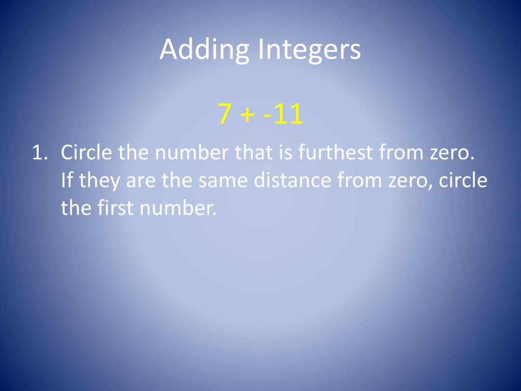 Adding Integers 7 + -11 • Circle the number that is furthest from zero. If they are the same distance from zero, circle the first number. • If the other number has the same sign, circle it too; if it has a different sign, put a square around it