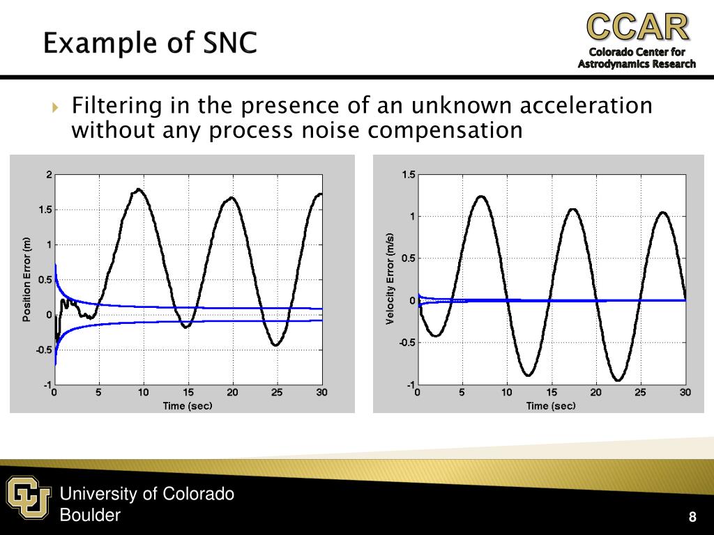 Example of SNC • Filtering in the presence of an unknown acceleration without any process noise compensation
