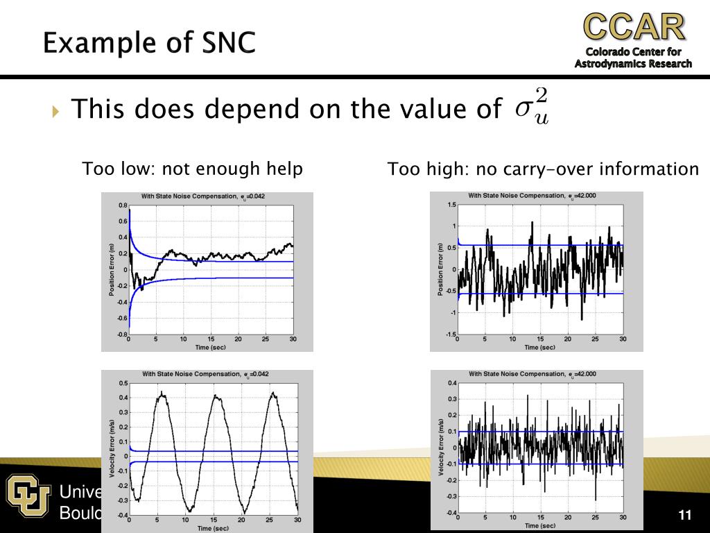 Status • Shown an example • Now we’ll derive the SNC and DMC formulations • Then we’ll apply them to our satellite state estimation problem.