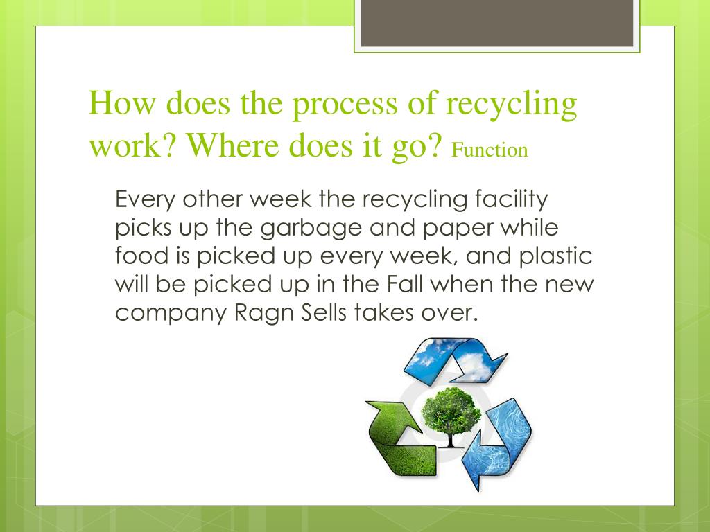 How does the process of recycling work? Where does it go? Function Every other week the recycling facility picks up the garbage and paper while food is picked up every week, and plastic will be picked up in the Fall when the new company Ragn Sells takes over.