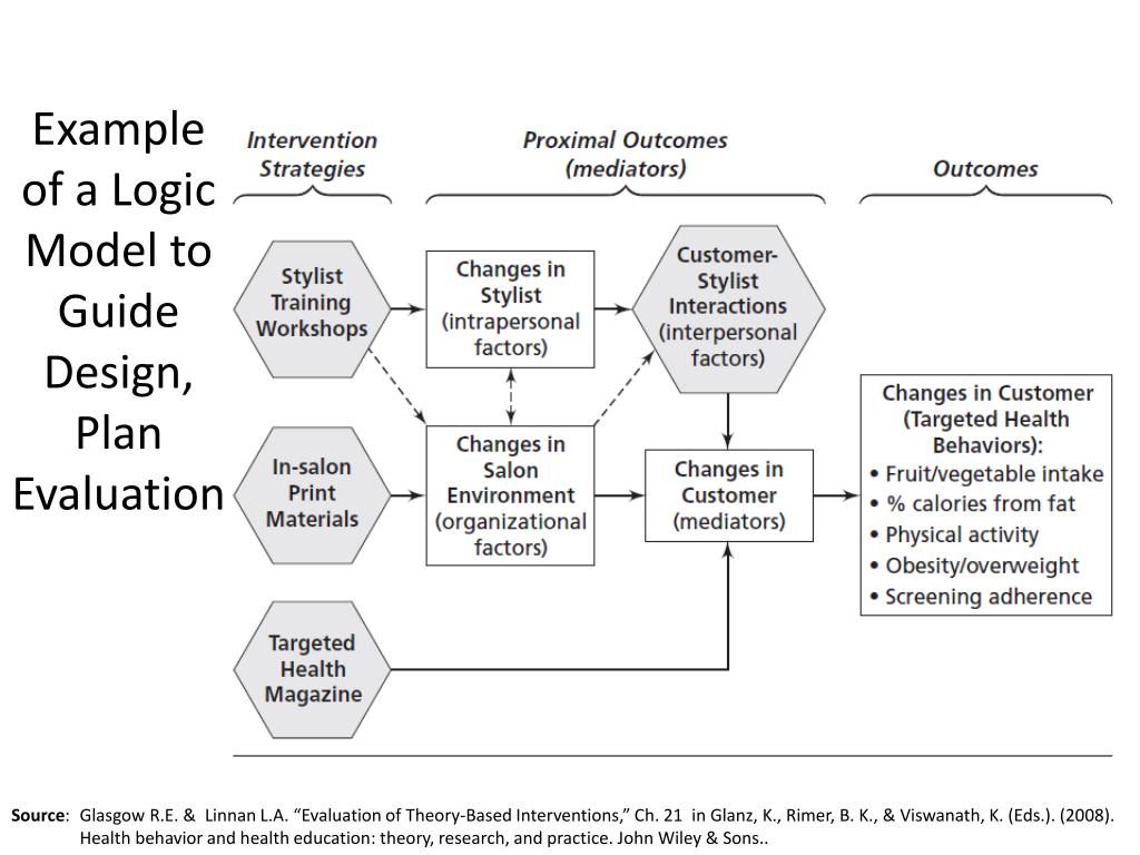 Example of a Logic Model to GuideDesign, Plan Evaluation Source: Glasgow R.E. & Linnan L.A. “Evaluation of Theory-Based Interventions,” Ch. 21 in Glanz, K., Rimer, B. K., & Viswanath, K. (Eds.). (2008). Health behavior and health education: theory, research, and practice. John Wiley & Sons..