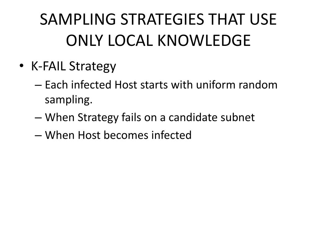 SAMPLING STRATEGIES THAT USE ONLY LOCAL KNOWLEDGE • K-FAIL Strategy • Each infected Host starts with uniform random sampling. • When Strategy fails on a candidate subnet • When Host becomes infected