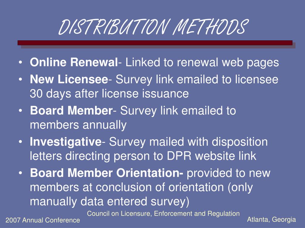 DISTRIBUTION METHODS • Online Renewal- Linked to renewal web pages • New Licensee- Survey link emailed to licensee 30 days after license issuance • Board Member- Survey link emailed to members annually • Investigative- Survey mailed with disposition letters directing person to DPR website link • Board Member Orientation- provided to new members at conclusion of orientation (only manually data entered survey) Council on Licensure, Enforcement and Regulation