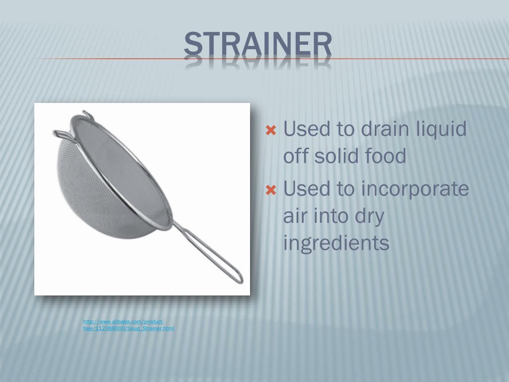 strainer • Used to drain liquid off solid food • Used to incorporate air into dry ingredients http://www.alibaba.com/product-free/112388000/Soup_Strainer.html