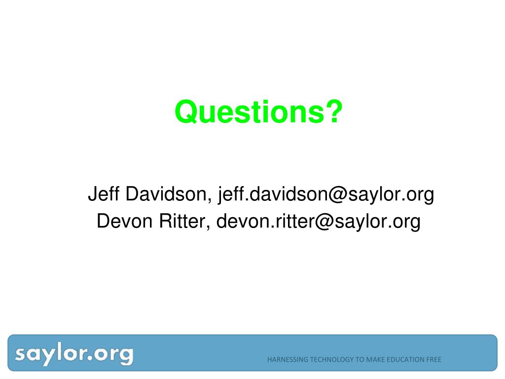 Questions? Jeff Davidson, jeff.davidson@saylor.org Devon Ritter, devon.ritter@saylor.org HARNESSING TECHNOLOGY TO MAKE EDUCATION FREE