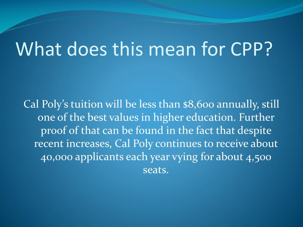 What does this mean for CPP? Cal Poly’s tuition will be less than $8,600 annually, still one of the best values in higher education. Further proof of that can be found in the fact that despite recent increases, Cal Poly continues to receive about 40,000 applicants each year vying for about 4,500 seats.