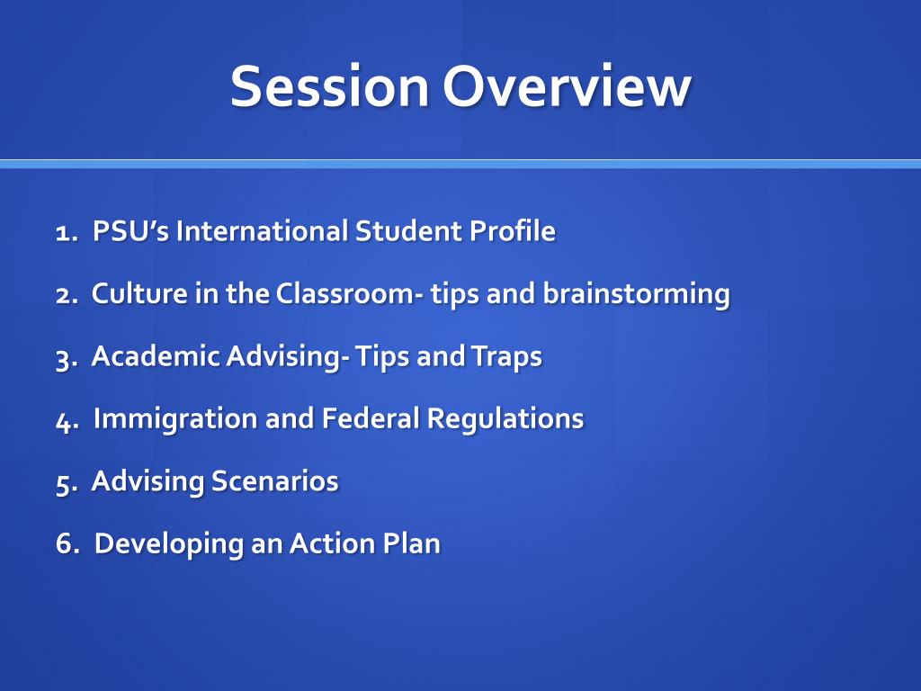 Session Overview 1. PSU’s International Student Profile 2. Culture in the Classroom- tips and brainstorming 3. Academic Advising- Tips and Traps 4. Immigration and Federal Regulations 5. Advising Scenarios 6. Developing an Action Plan