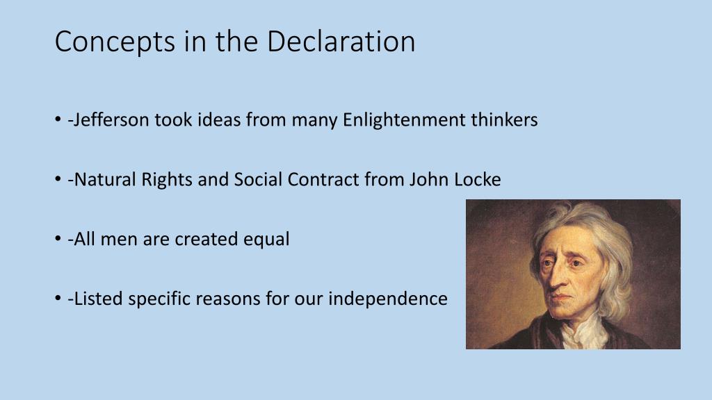Concepts in the Declaration • -Jefferson took ideas from many Enlightenment thinkers • -Natural Rights and Social Contract from John Locke • -All men are created equal • -Listed specific reasons for our independence