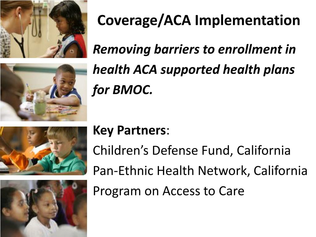 Coverage/ACA Implementation Removing barriers to enrollment in health ACA supported health plans for BMOC. Key Partners: Children’s Defense Fund, California Pan-Ethnic Health Network, California Program on Access to Care