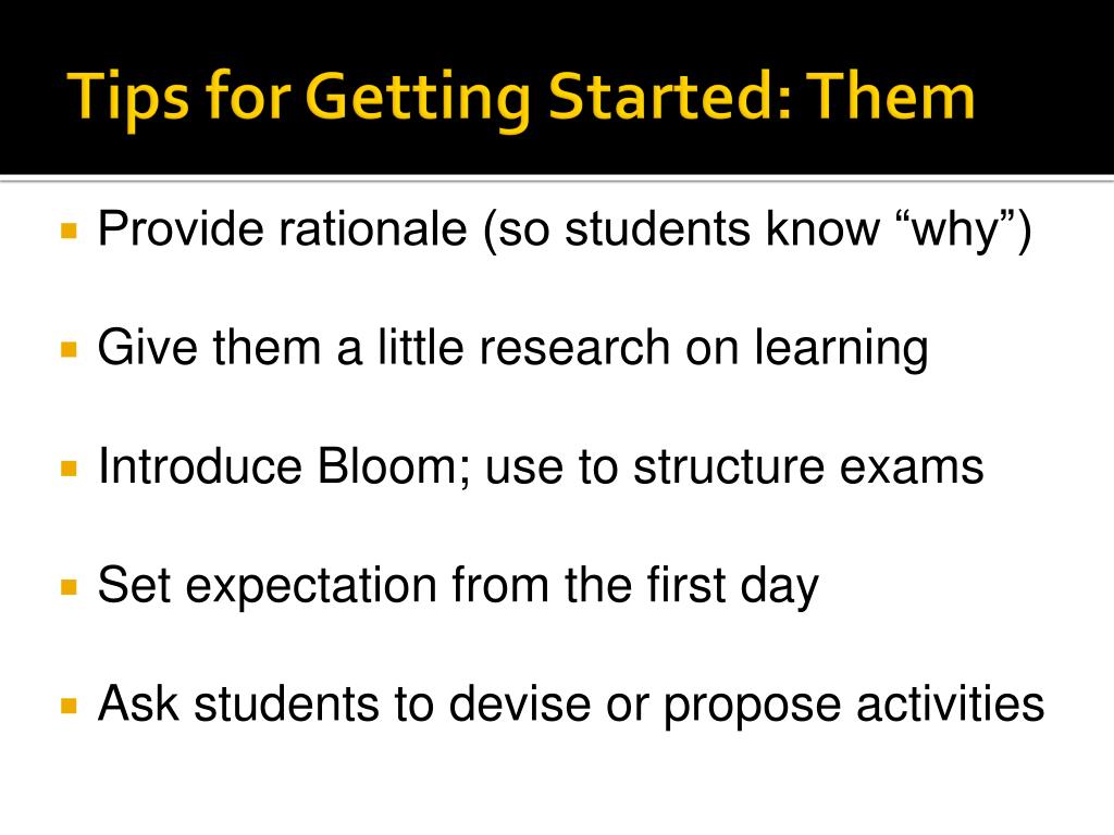 Tips for Getting Started: Them Provide rationale (so students know “why”) Give them a little research on learning Introduce Bloom; use to structure exams Set expectation from the first day Ask students to devise or propose activities