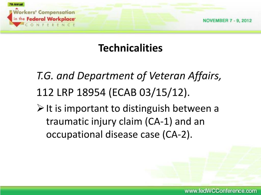 Technicalities T.G. and Department of Veteran Affairs, 112 LRP 18954 (ECAB 03/15/12). • It is important to distinguish between a traumatic injury claim (CA-1) and an occupational disease case (CA-2).