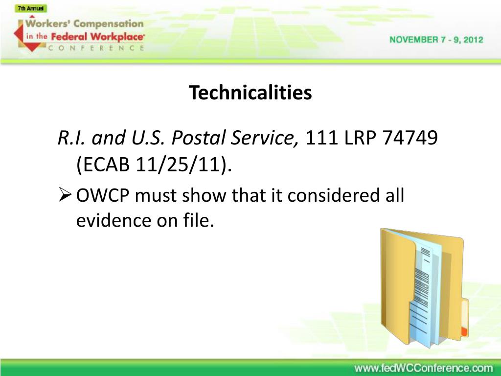 Technicalities R.I. and U.S. Postal Service, 111 LRP 74749 (ECAB 11/25/11). • OWCP must show that it considered all evidence on file.