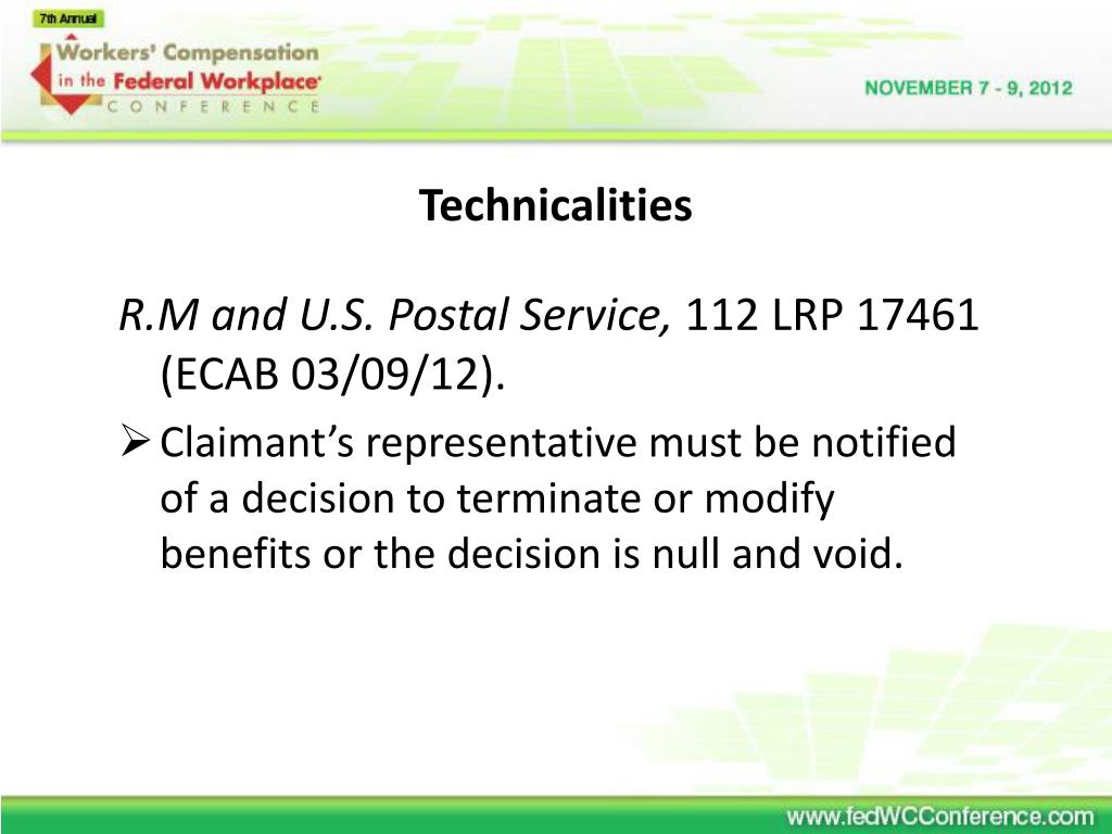 Technicalities R.M and U.S. Postal Service, 112 LRP 17461 (ECAB 03/09/12). • Claimant’s representative must be notified of a decision to terminate or modify benefits or the decision is null and void.