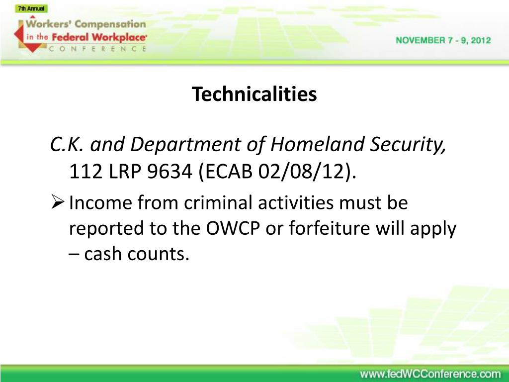Technicalities C.K. and Department of Homeland Security, 112 LRP 9634 (ECAB 02/08/12). • Income from criminal activities must be reported to the OWCP or forfeiture will apply – cash counts.