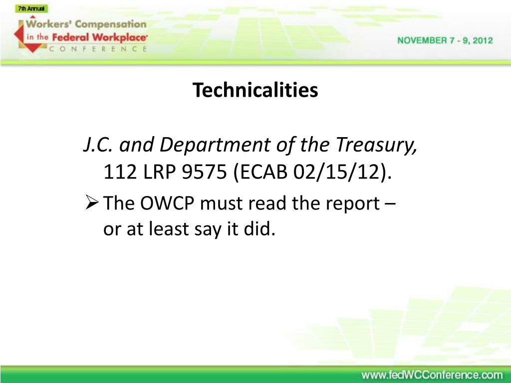 Technicalities J.C. and Department of the Treasury, 112 LRP 9575 (ECAB 02/15/12). • The OWCP must read the report – or at least say it did.