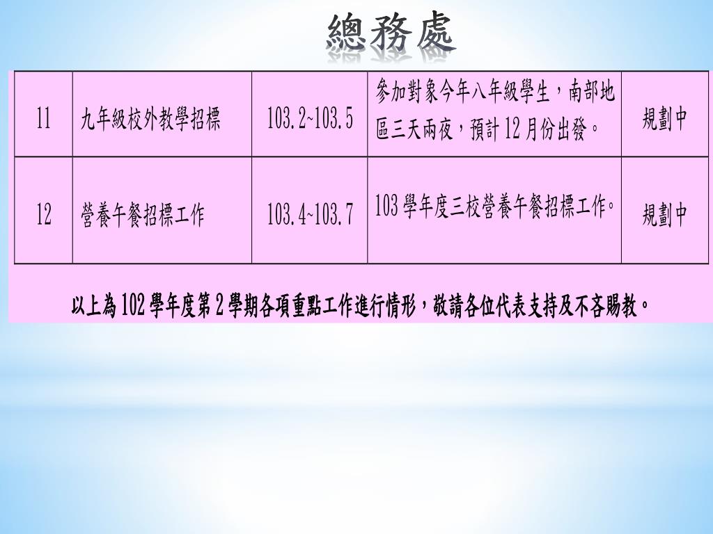 新竹 市立虎林國民中學 102 學年度 第 2 學期期 初校務 會議 會議 議程 一 、主席致詞 二 、各處室業務報告 三 、提案 討論 四 、 臨時 提案 五 、主席結論 六、散會. 會議時間 :103 年 2 月 21 日 中 午 12 時 10 分. 教務處. 教務處. 教務處. 學務處. 總務處. 總務處. 總務處. 輔導處. 輔導處. 輔導處. 一、法規宣導 : ◎ 公教人員保險法修正案業經總統於民國 103 年 1 月 29 日修正公布 , 並 已刊載於總統府公報第 7124 期,條文業已公告本校網站 - 最新