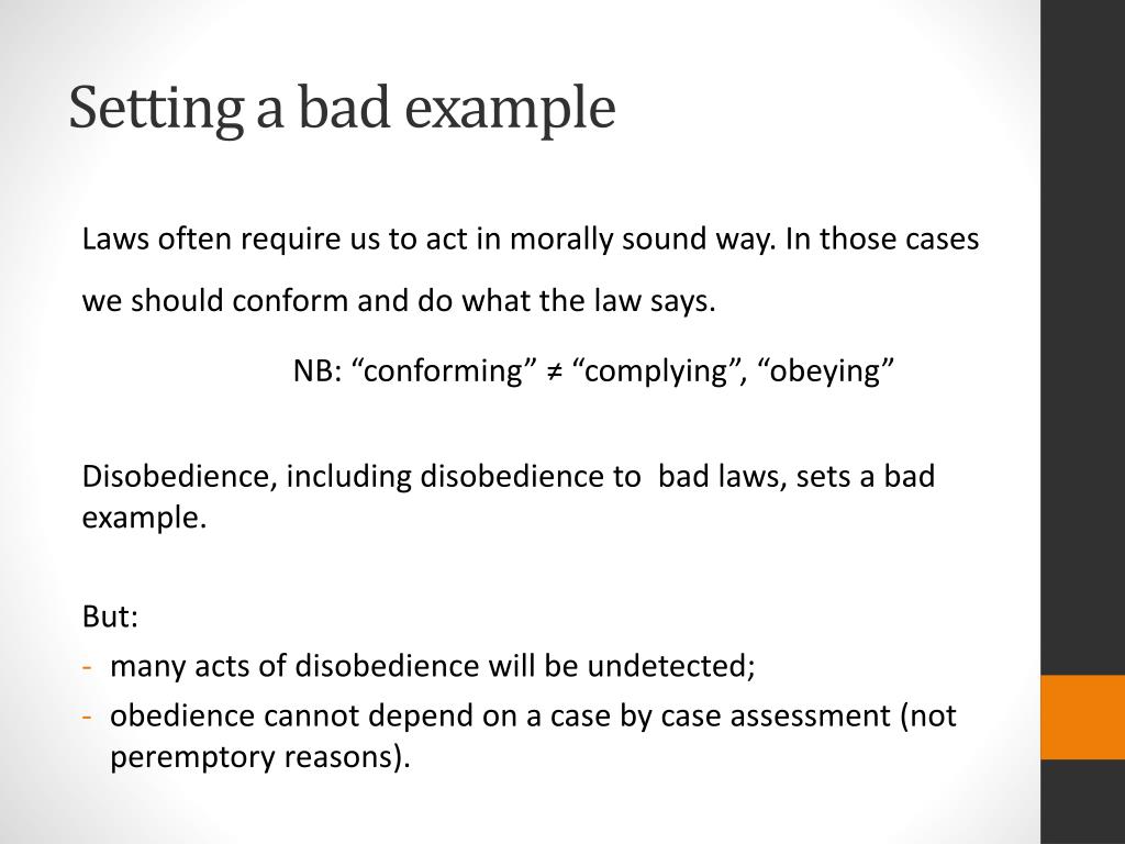 Setting a bad example Laws often require us to act in morally sound way. In those cases we should conform and do what the law says. NB: “conforming” ≠ “complying”, “obeying” Disobedience, including disobedience to bad laws, sets a bad example. But: • many acts of disobedience will be undetected; • obedience cannot depend on a case by case assessment (not peremptory reasons).