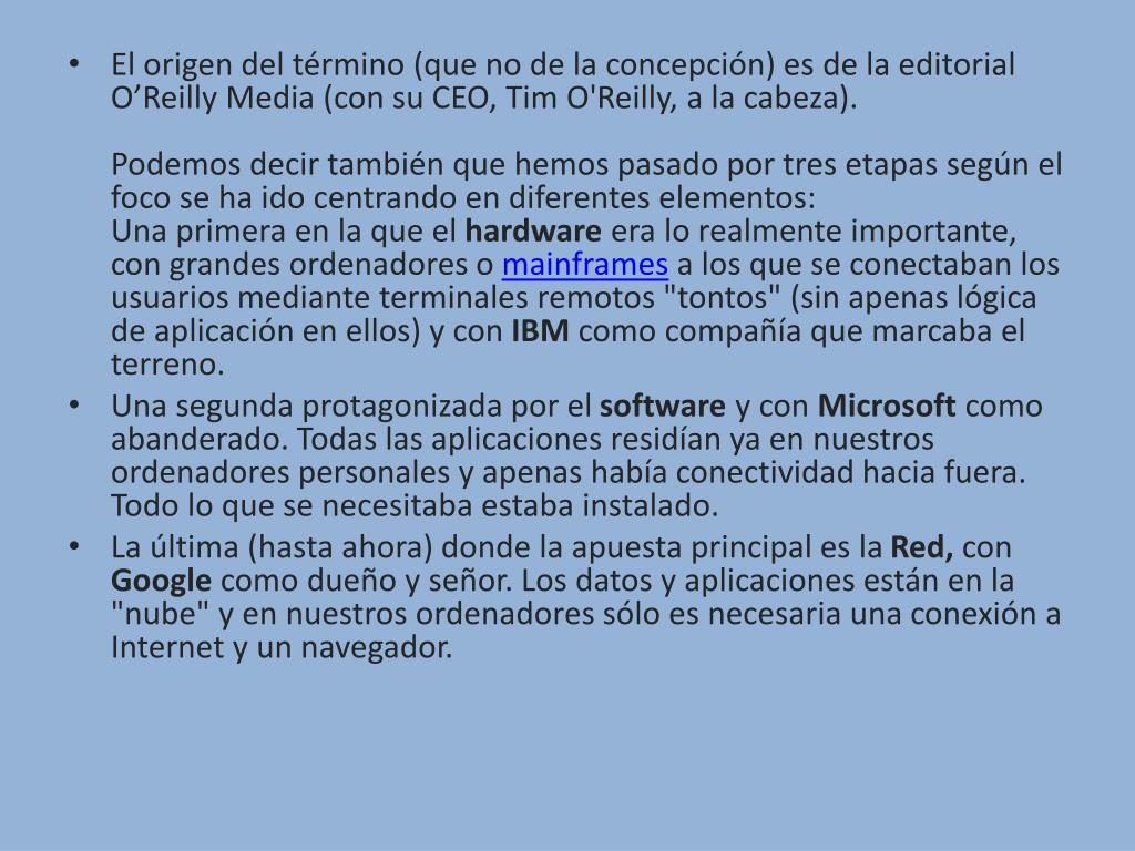 El origen del término (que no de la concepción) es de la editorial O’Reilly Media (con su CEO, Tim O'Reilly, a la cabeza).Podemos decir también que hemos pasado por tres etapas según el foco se ha ido centrando en diferentes elementos:Una primera en la que el hardware era lo realmente importante, con grandes ordenadores o mainframes a los que se conectaban los usuarios mediante terminales remotos "tontos" (sin apenas lógica de aplicación en ellos) y con IBM como compañía que marcaba el terreno. • Una segunda protagonizada por el software y con Microsoft como abanderado. Todas las aplicaciones residían ya en nuestros ordenadores personales y apenas había conectividad hacia fuera. Todo lo que se necesitaba estaba instalado. • La última (hasta ahora) donde la apuesta principal es la Red, con Google como dueño y señor. Los datos y aplicaciones están en la "nube" y en nuestros ordenadores sólo es necesaria una conexión a Internet y un navegador.