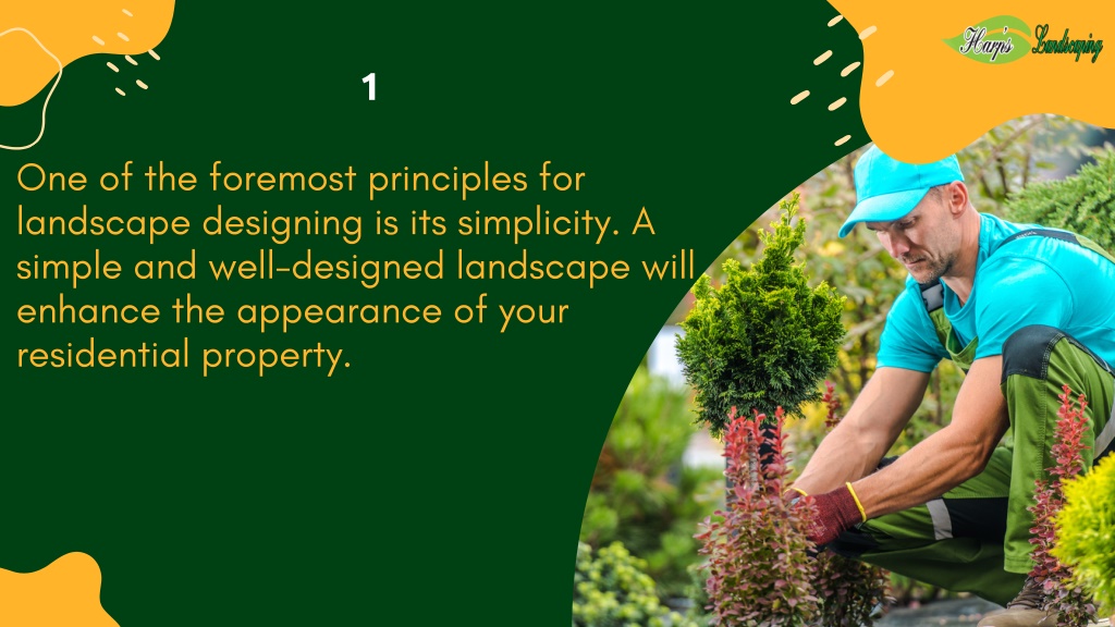1 One of the foremost principles for landscape designing is its simplicity. A simple and well-designed landscape will enhance the appearance of your residential property.