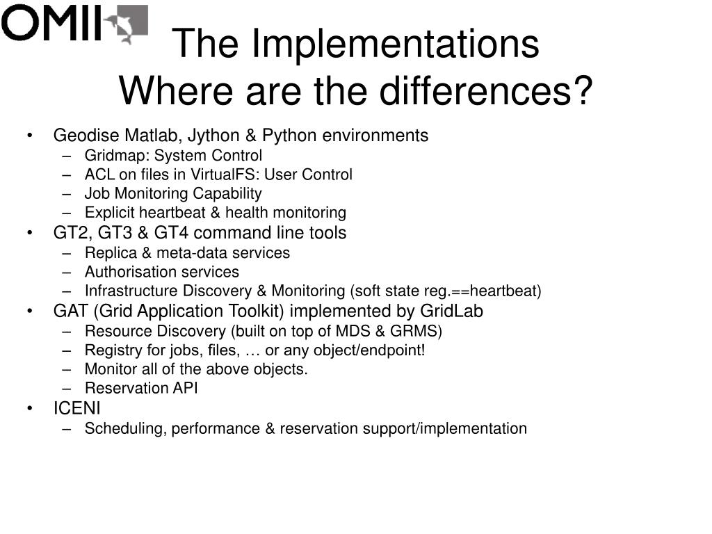The ImplementationsWhere are the differences? • Geodise Matlab, Jython & Python environments • Gridmap: System Control • ACL on files in VirtualFS: User Control • Job Monitoring Capability • Explicit heartbeat & health monitoring • GT2, GT3 & GT4 command line tools • Replica & meta-data services • Authorisation services • Infrastructure Discovery & Monitoring (soft state reg.==heartbeat) • GAT (Grid Application Toolkit) implemented by GridLab • Resource Discovery (built on top of MDS & GRMS) • Registry for jobs, files, … or any object/endpoint! • Monitor all of the above objects. • Reservation API • ICENI • Scheduling, performance & reservation support/implementation