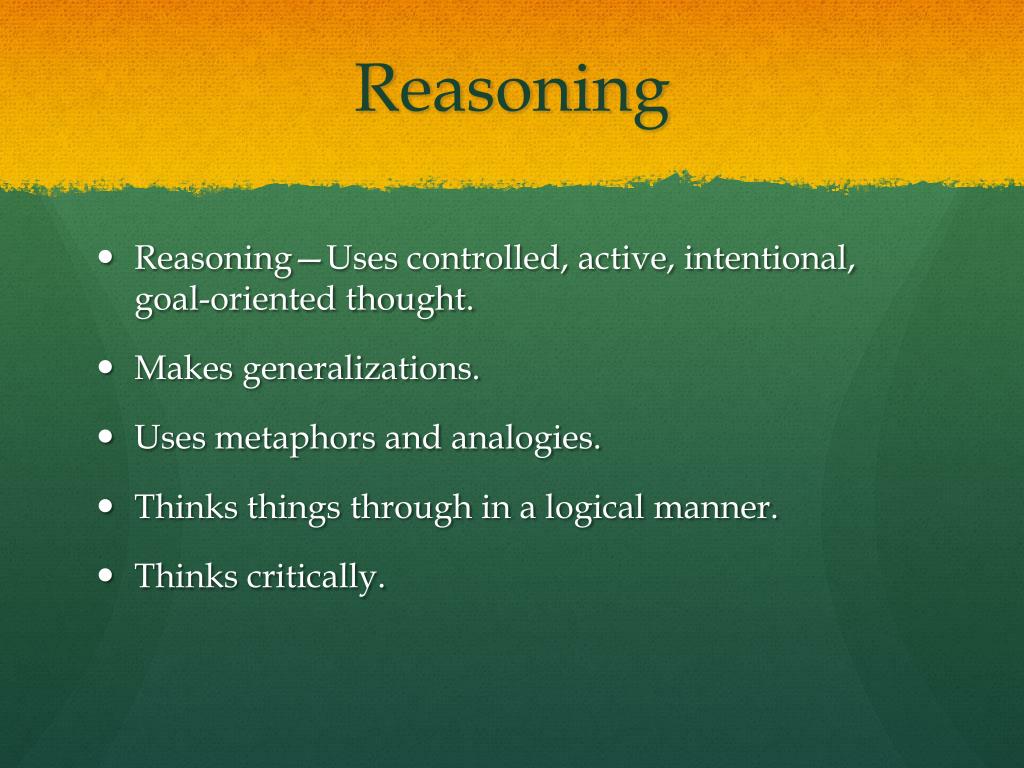Reasoning • Reasoning—Uses controlled, active, intentional, goal-oriented thought. • Makes generalizations. • Uses metaphors and analogies. • Thinks things through in a logical manner. • Thinks critically.