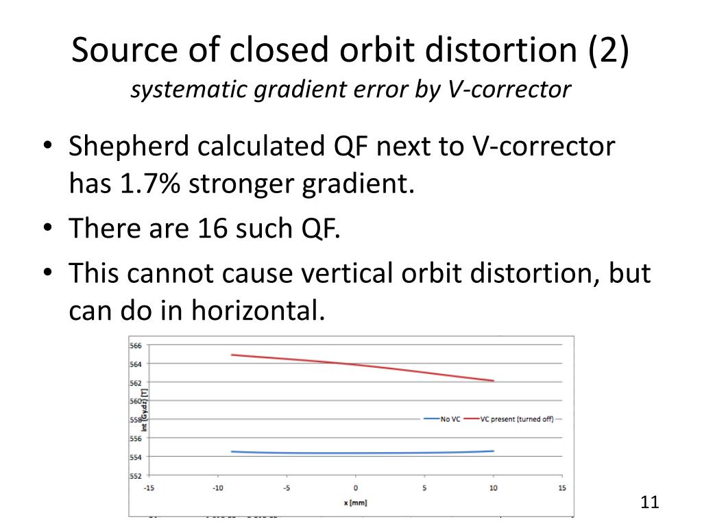 Source of closed orbit distortion (2)systematic gradient error by V-corrector • Shepherd calculated QF next to V-corrector has 1.7% stronger gradient. • There are 16 such QF. • This cannot cause vertical orbit distortion, but can do in horizontal.
