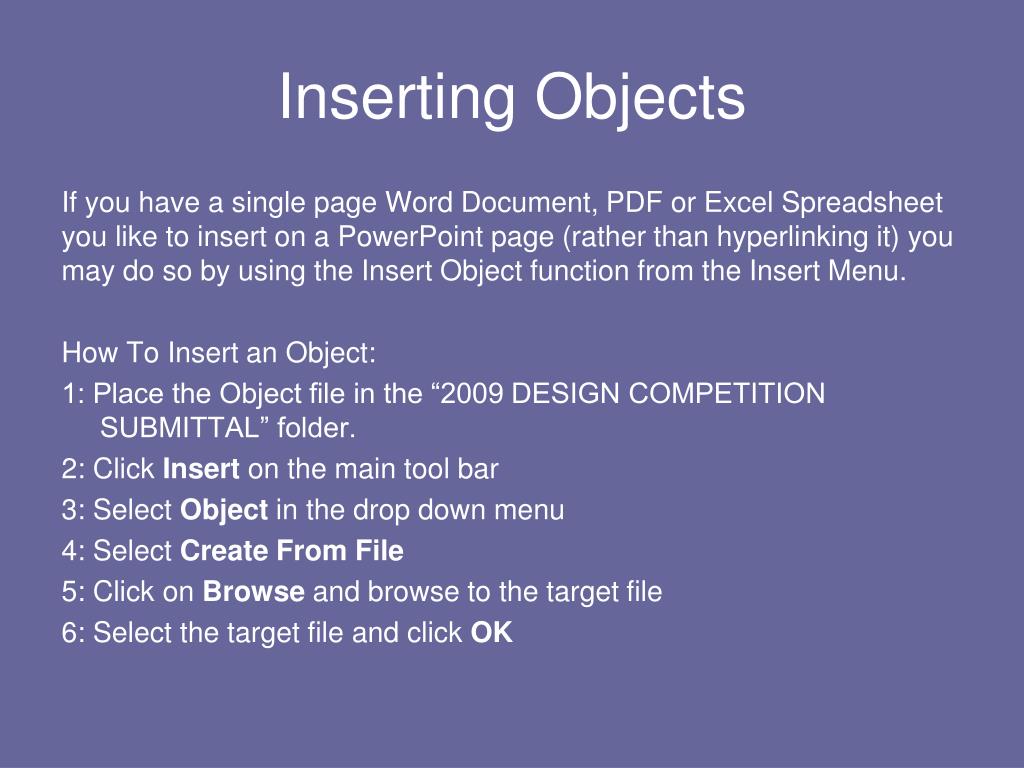 Inserting Objects If you have a single page Word Document, PDF or Excel Spreadsheet you like to insert on a PowerPoint page (rather than hyperlinking it) you may do so by using the Insert Object function from the Insert Menu. How To Insert an Object: 1: Place the Object file in the “2009 DESIGN COMPETITION SUBMITTAL” folder. 2: Click Insert on the main tool bar 3: Select Object in the drop down menu 4: Select Create From File 5: Click on Browse and browse to the target file 6: Select the target file and click OK