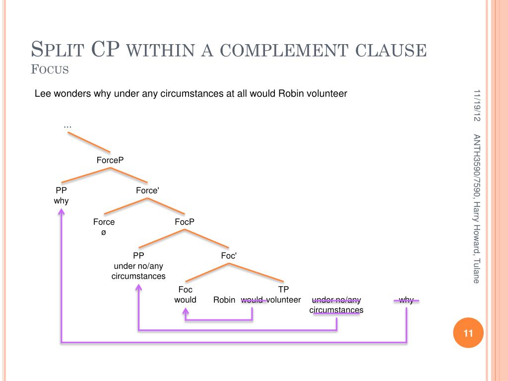 Split CP within a complement clauseFocus Lee wonders why under any circumstances at all would Robin volunteer … ForceP PP why Force' ANTH3590/7590, Harry Howard, Tulane Force ø FocP PP under no/any circumstances Foc' Foc would TP volunteer would under no/any circumstances why Robin