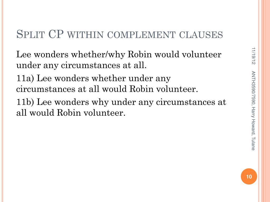 Split CP within complement clauses Lee wonders whether/why Robin would volunteer under any circumstances at all. 11a) Lee wonders whether under any circumstances at all would Robin volunteer. 11b) Lee wonders why under any circumstances at all would Robin volunteer. ANTH3590/7590, Harry Howard, Tulane