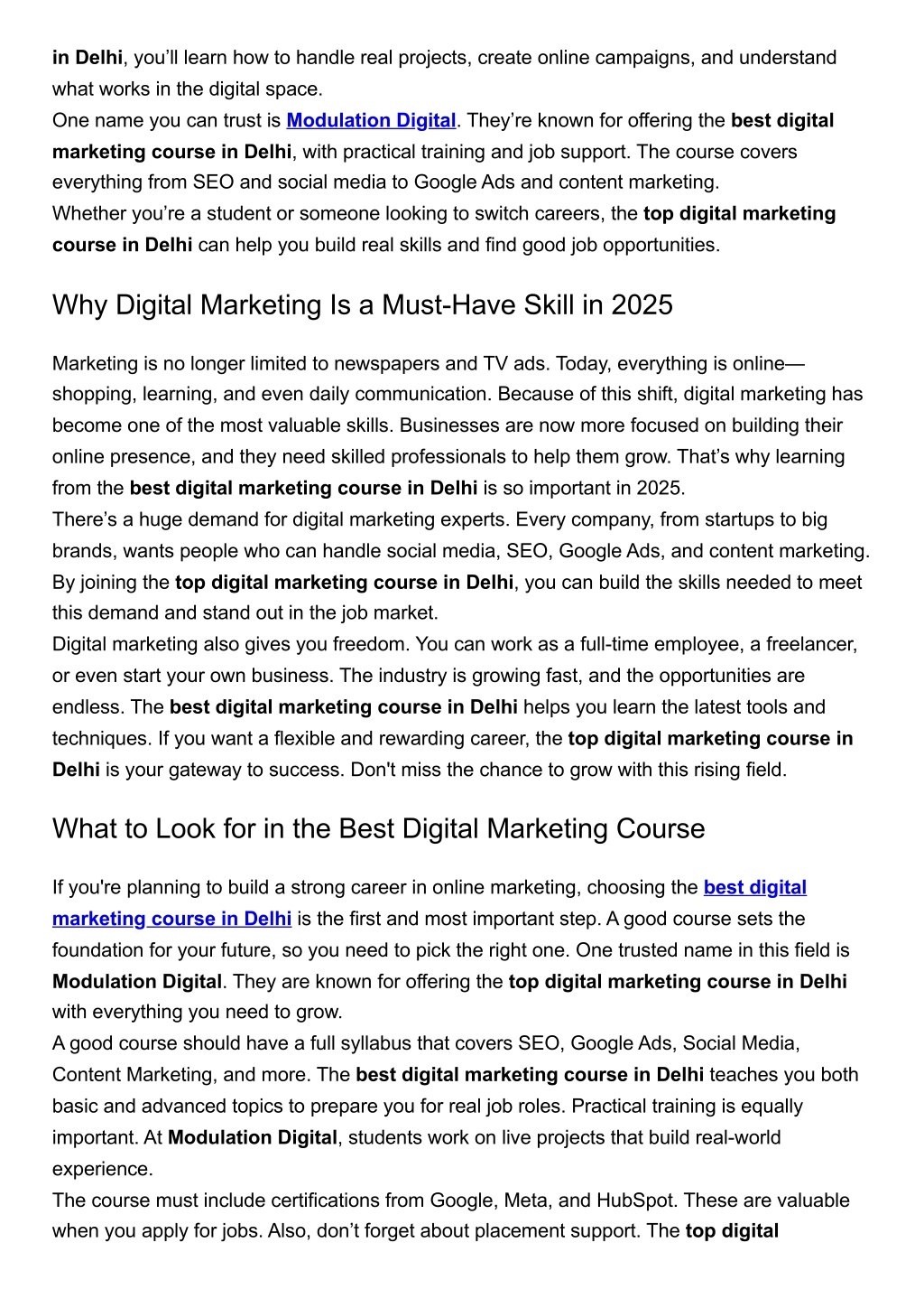 in Delhi, you’ll learn how to handle real projects, create online campaigns, and understand what works in the digital space. One name you can trust is Modulation Digital. They’re known for offering the best digital marketing course in Delhi, with practical training and job support. The course covers everything from SEO and social media to Google Ads and content marketing. Whether you’re a student or someone looking to switch careers, the top digital marketing course in Delhi can help you build real skills and find good job opportunities. Why Digital Marketing Is a Must-Have Skill in 2025 Marketing is no longer limited to newspapers and TV ads. Today, everything is online— shopping, learning, and even daily communication. Because of this shift, digital marketing has become one of the most valuable skills. Businesses are now more focused on building their online presence, and they need skilled professionals to help them grow. That’s why learning from the best digital marketing course in Delhi is so important in 2025. There’s a huge demand for digital marketing experts. Every company, from startups to big brands, wants people who can handle social media, SEO, Google Ads, and content marketing. By joining the top digital marketing course in Delhi, you can build the skills needed to meet this demand and stand out in the job market. Digital marketing also gives you freedom. You can work as a full-time employee, a freelancer, or even start your own business. The industry is growing fast, and the opportunities are endless. The best digital marketing course in Delhi helps you learn the latest tools and techniques. If you want a flexible and rewarding career, the top digital marketing course in Delhi is your gateway to success. Don't miss the chance to grow with this rising field. What to Look for in the Best Digital Marketing Course If you're planning to build a strong career in online marketing, choosing the best digital marketing course in Delhi is the first and most important step. A good course sets the foundation for your future, so you need to pick the right one. One trusted name in this field is Modulation Digital. They are known for offering the top digital marketing course in Delhi with everything you need to grow. A good course should have a full syllabus that covers SEO, Google Ads, Social Media, Content Marketing, and more. The best digital marketing course in Delhi teaches you both basic and advanced topics to prepare you for real job roles. Practical training is equally important. At Modulation Digital, students work on live projects that build real-world experience. The course must include certifications from Google, Meta, and HubSpot. These are valuable when you apply for jobs. Also, don’t forget about placement support. The top digital