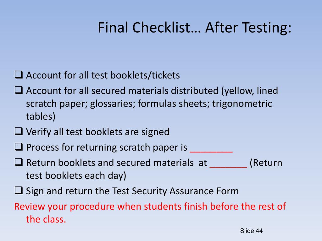 Final Checklist… After Testing: • Account for all test booklets/tickets • Account for all secured materials distributed (yellow, lined scratch paper; glossaries; formulas sheets; trigonometric tables) • Verify all test booklets are signed • Process for returning scratch paper is ________ • Return booklets and secured materials at _______ (Return test booklets each day) • Sign and return the Test Security Assurance Form Review your procedure when students finish before the rest of the class. Slide 44