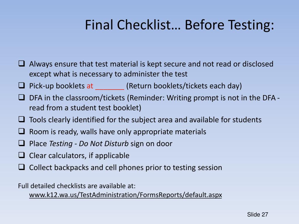 Final Checklist… Before Testing: • Always ensure that test material is kept secure and not read or disclosed except what is necessary to administer the test • Pick-up booklets at _______ (Return booklets/tickets each day) • DFA in the classroom/tickets (Reminder: Writing prompt is not in the DFA - read from a student test booklet) • Tools clearly identified for the subject area and available for students • Room is ready, walls have only appropriate materials • Place Testing - Do Not Disturb sign on door • Clear calculators, if applicable • Collect backpacks and cell phones prior to testing session Full detailed checklists are available at: www.k12.wa.us/TestAdministration/FormsReports/default.aspx Slide 27