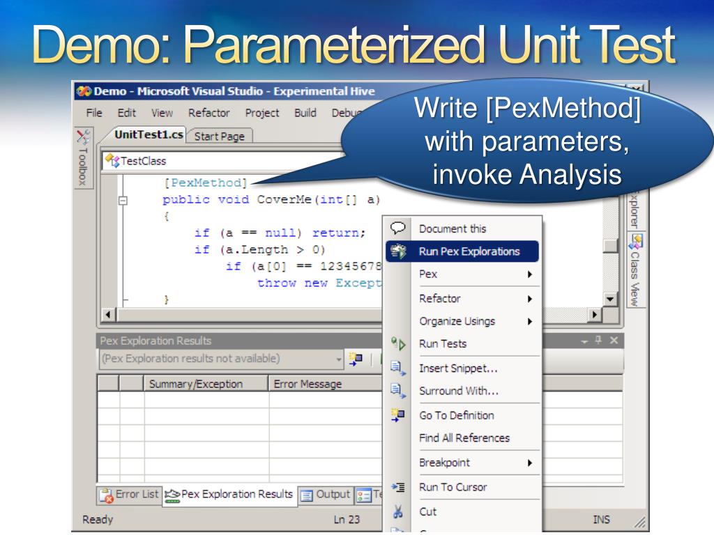 Demo: Parameterized Unit Test Write [PexMethod] with parameters, invoke Analysis