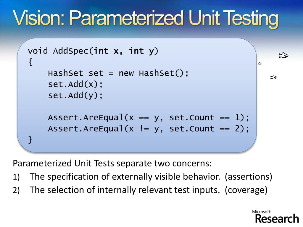 Vision: Parameterized Unit Testing void AddSpec(int x, int y) { HashSet set = new HashSet(); set.Add(x); set.Add(y); Assert.AreEqual(x == y, set.Count == 1); Assert.AreEqual(x != y, set.Count == 2); } Parameterized Unit Tests separate two concerns: • The specification of externally visible behavior. (assertions) • The selection of internally relevant test inputs. (coverage)