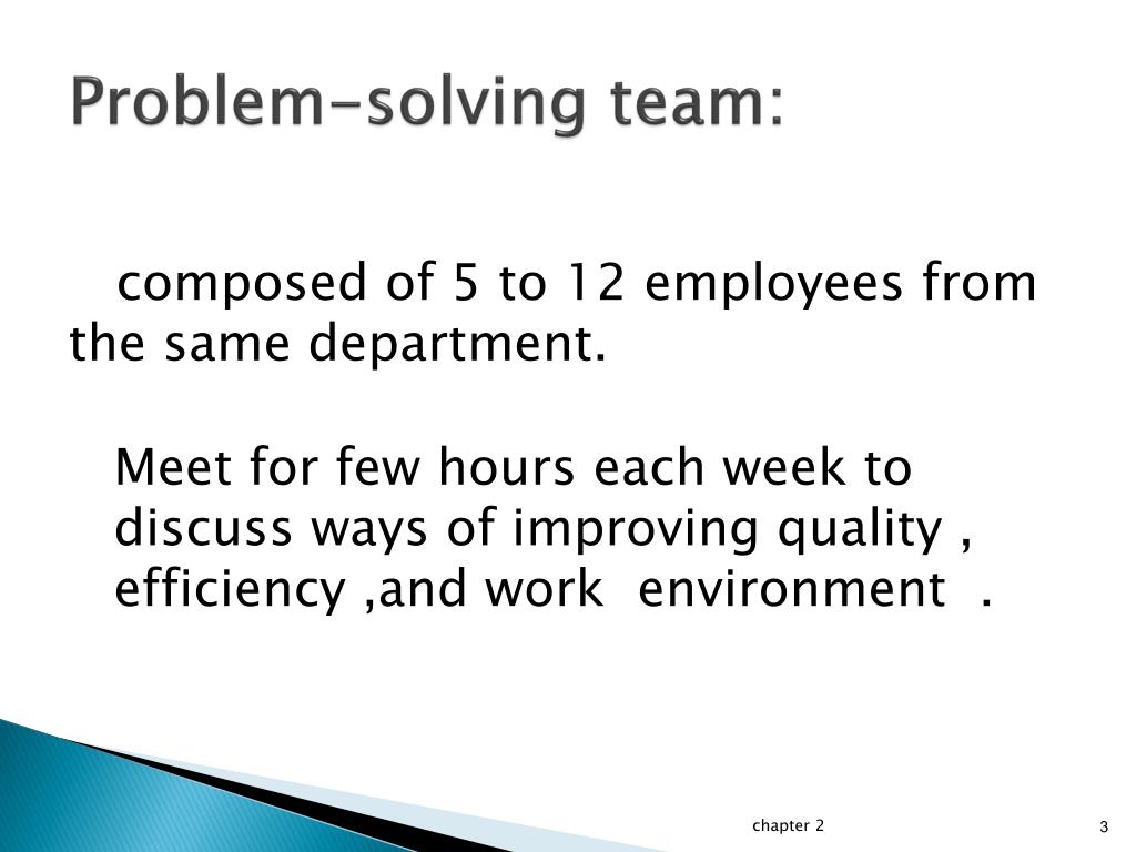 Problem-solving team: composed of 5 to 12 employees from the same department. Meet for few hours each week to discuss ways of improving quality , efficiency ,and work environment . chapter 2