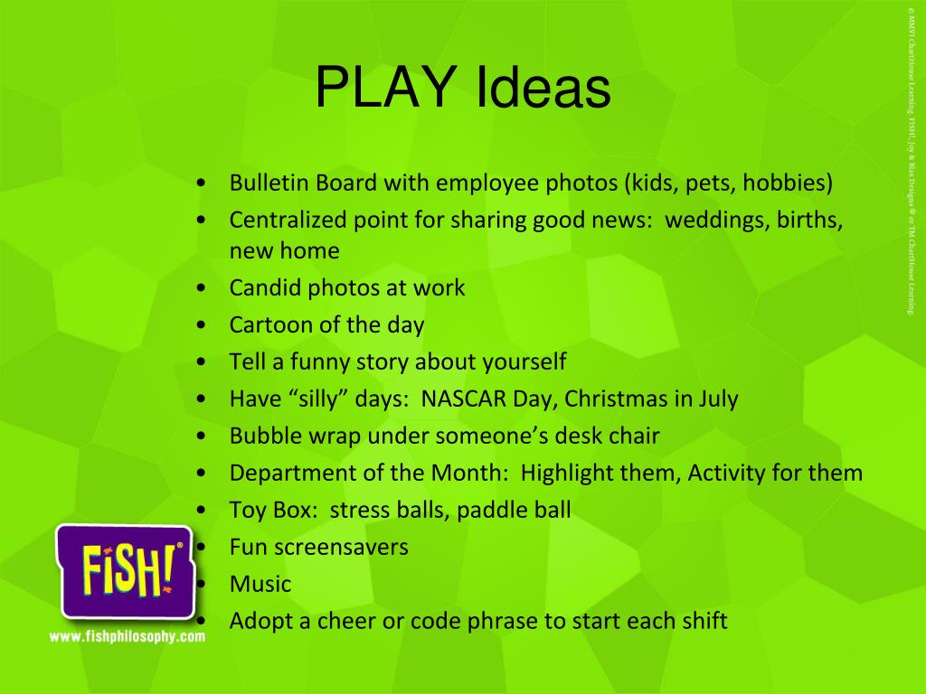 PLAY Ideas • Bulletin Board with employee photos (kids, pets, hobbies) • Centralized point for sharing good news: weddings, births, new home • Candid photos at work • Cartoon of the day • Tell a funny story about yourself • Have “silly” days: NASCAR Day, Christmas in July • Bubble wrap under someone’s desk chair • Department of the Month: Highlight them, Activity for them • Toy Box: stress balls, paddle ball • Fun screensavers • Music • Adopt a cheer or code phrase to start each shift