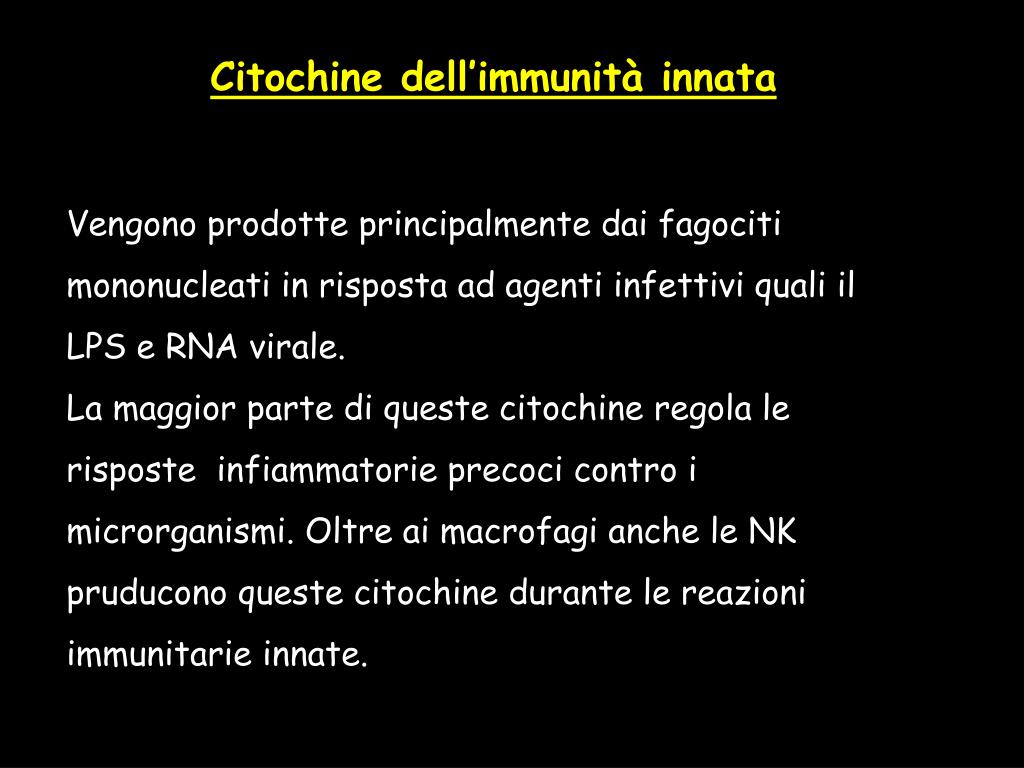 Citochine dell’immunità innata Vengono prodotte principalmente dai fagociti mononucleati in risposta ad agenti infettivi quali il LPS e RNA virale. La maggior parte di queste citochine regola le risposte infiammatorie precoci contro i microrganismi. Oltre ai macrofagi anche le NK pruducono queste citochine durante le reazioni immunitarie innate.