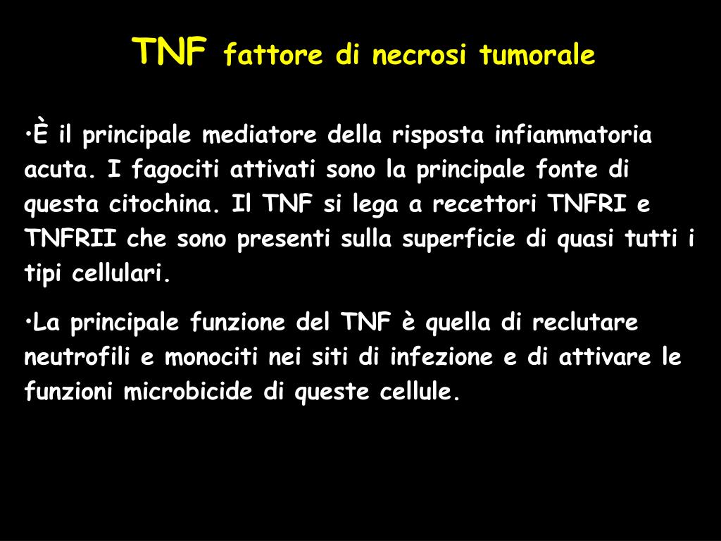 TNF fattore di necrosi tumorale • È il principale mediatore della risposta infiammatoria acuta. I fagociti attivati sono la principale fonte di questa citochina. Il TNF si lega a recettori TNFRI e TNFRII che sono presenti sulla superficie di quasi tutti i tipi cellulari. • La principale funzione del TNF è quella di reclutare neutrofili e monociti nei siti di infezione e di attivare le funzioni microbicide di queste cellule.
