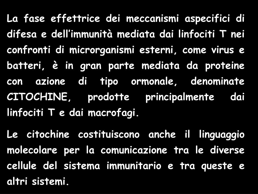 La fase effettrice dei meccanismi aspecifici di difesa e dell’immunità mediata dai linfociti T nei confronti di microrganismi esterni, come virus e batteri, è in gran parte mediata da proteine con azione di tipo ormonale, denominate CITOCHINE, prodotte principalmente dai linfociti T e dai macrofagi. Le citochine costituiscono anche il linguaggio molecolare per la comunicazione tra le diverse cellule del sistema immunitario e tra queste e altri sistemi.