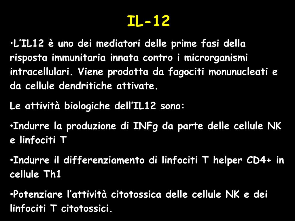IL-12 • L’IL12 è uno dei mediatori delle prime fasi della risposta immunitaria innata contro i microrganismi intracellulari. Viene prodotta da fagociti monunucleati e da cellule dendritiche attivate. • Le attività biologiche dell’IL12 sono: • Indurre la produzione di INFg da parte delle cellule NK e linfociti T • Indurre il differenziamento di linfociti T helper CD4+ in cellule Th1 • Potenziare l’attività citotossica delle cellule NK e dei linfociti T citotossici.