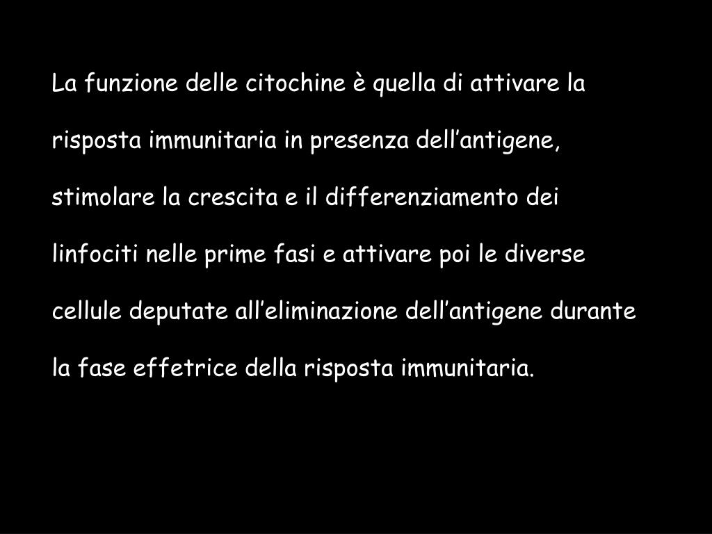 La funzione delle citochine è quella di attivare la risposta immunitaria in presenza dell’antigene, stimolare la crescita e il differenziamento dei linfociti nelle prime fasi e attivare poi le diverse cellule deputate all’eliminazione dell’antigene durante la fase effetrice della risposta immunitaria.