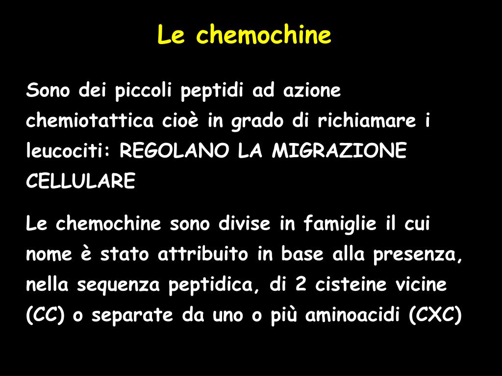 Le chemochine Sono dei piccoli peptidi ad azione chemiotattica cioè in grado di richiamare i leucociti: REGOLANO LA MIGRAZIONE CELLULARE Le chemochine sono divise in famiglie il cui nome è stato attribuito in base alla presenza, nella sequenza peptidica, di 2 cisteine vicine (CC) o separate da uno o più aminoacidi (CXC)
