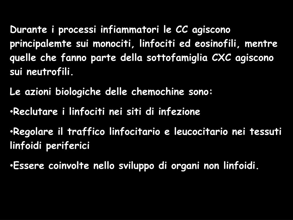 Durante i processi infiammatori le CC agiscono principalemte sui monociti, linfociti ed eosinofili, mentre quelle che fanno parte della sottofamiglia CXC agiscono sui neutrofili. • Le azioni biologiche delle chemochine sono: • Reclutare i linfociti nei siti di infezione • Regolare il traffico linfocitario e leucocitario nei tessuti linfoidi periferici • Essere coinvolte nello sviluppo di organi non linfoidi.