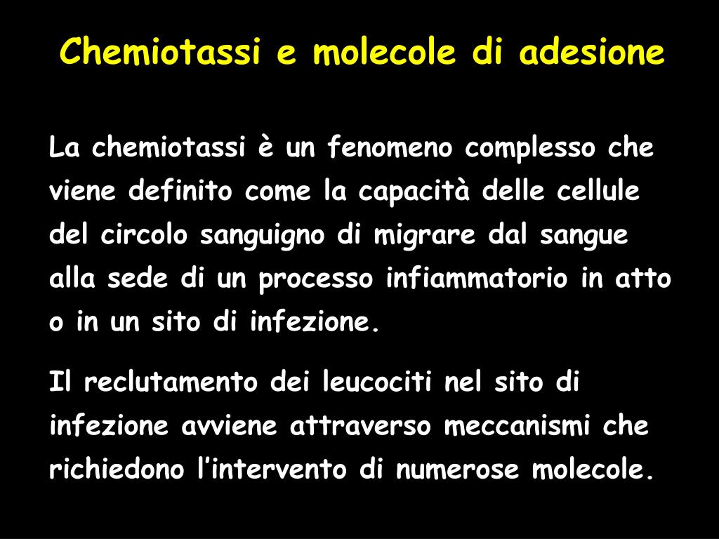 Chemiotassi e molecole di adesione La chemiotassi è un fenomeno complesso che viene definito come la capacità delle cellule del circolo sanguigno di migrare dal sangue alla sede di un processo infiammatorio in atto o in un sito di infezione. Il reclutamento dei leucociti nel sito di infezione avviene attraverso meccanismi che richiedono l’intervento di numerose molecole.