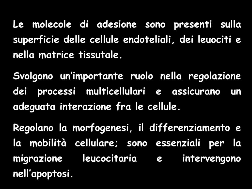 Le molecole di adesione sono presenti sulla superficie delle cellule endoteliali, dei leuociti e nella matrice tissutale. Svolgono un’importante ruolo nella regolazione dei processi multicellulari e assicurano un adeguata interazione fra le cellule. Regolano la morfogenesi, il differenziamento e la mobilità cellulare; sono essenziali per la migrazione leucocitaria e intervengono nell’apoptosi.