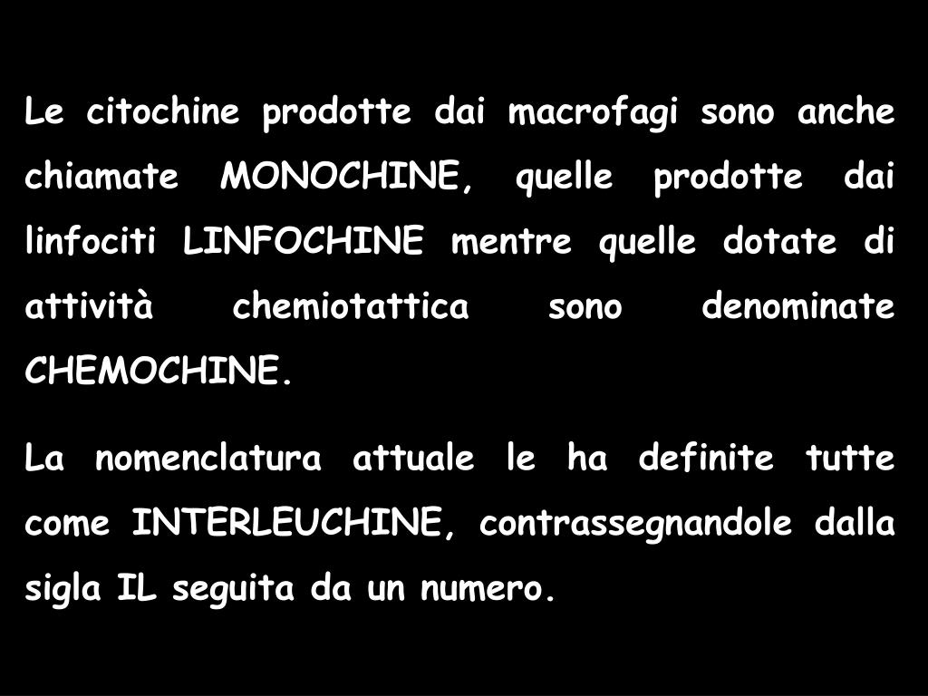 Le citochine prodotte dai macrofagi sono anche chiamate MONOCHINE, quelle prodotte dai linfociti LINFOCHINE mentre quelle dotate di attività chemiotattica sono denominate CHEMOCHINE. La nomenclatura attuale le ha definite tutte come INTERLEUCHINE, contrassegnandole dalla sigla IL seguita da un numero.